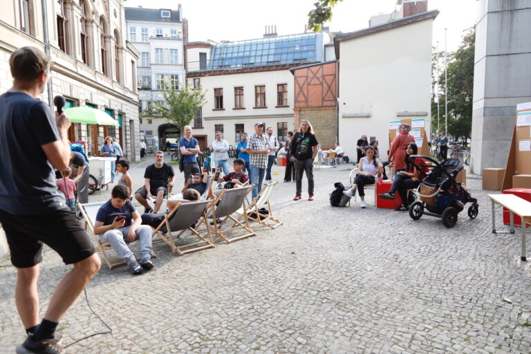 Der Quartiersrat tagt auf dem Vorplatz der Luisenbad-Bibliothek Wo sonst Bücher ausgeliehen, Hausaufgaben erledigt, Filmreihen veranstaltet und Geschichten entdeckt werden, …