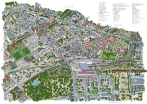 weiter lesenEine illustrierte Stadtteilkarte präsentiert das QM-Gebiet Badstraße Vor dem Bahnhof Gesundbrunnen rennen spielende Kinder und Hunde, während unten ein ICE einfährt. Im Fußballkäfig am Luisenbad wird der Ball so kräftig…