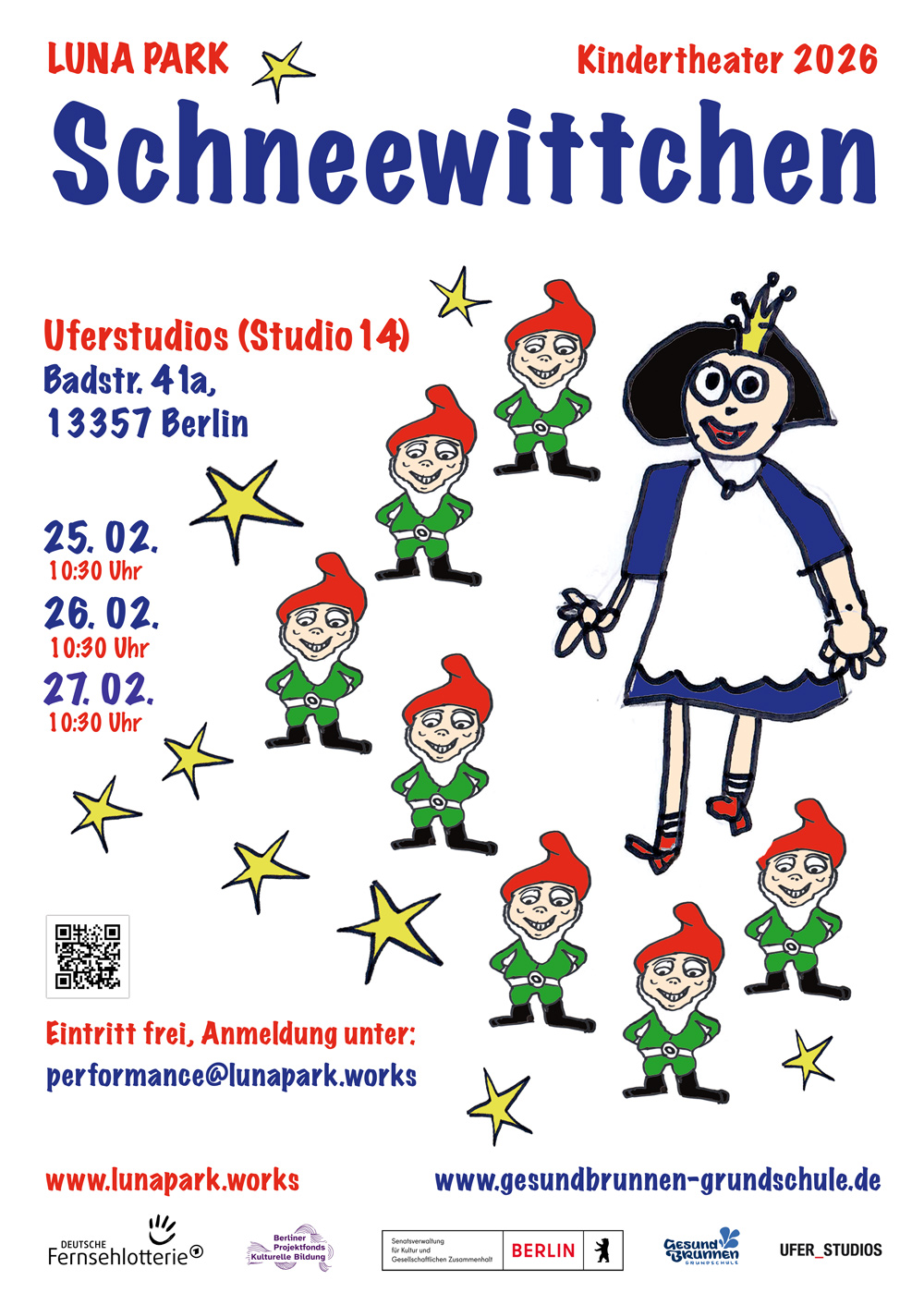 Die Präsentationen von SCHNEEWITTCHEN werden realisiert von der gemeinnützigen Initiative LUNA PARK e.V. in Zusammenarbeit mit der Gesundbrunnen-Grundschule und gefördert durch die Deutsche Fernsehlotterie.