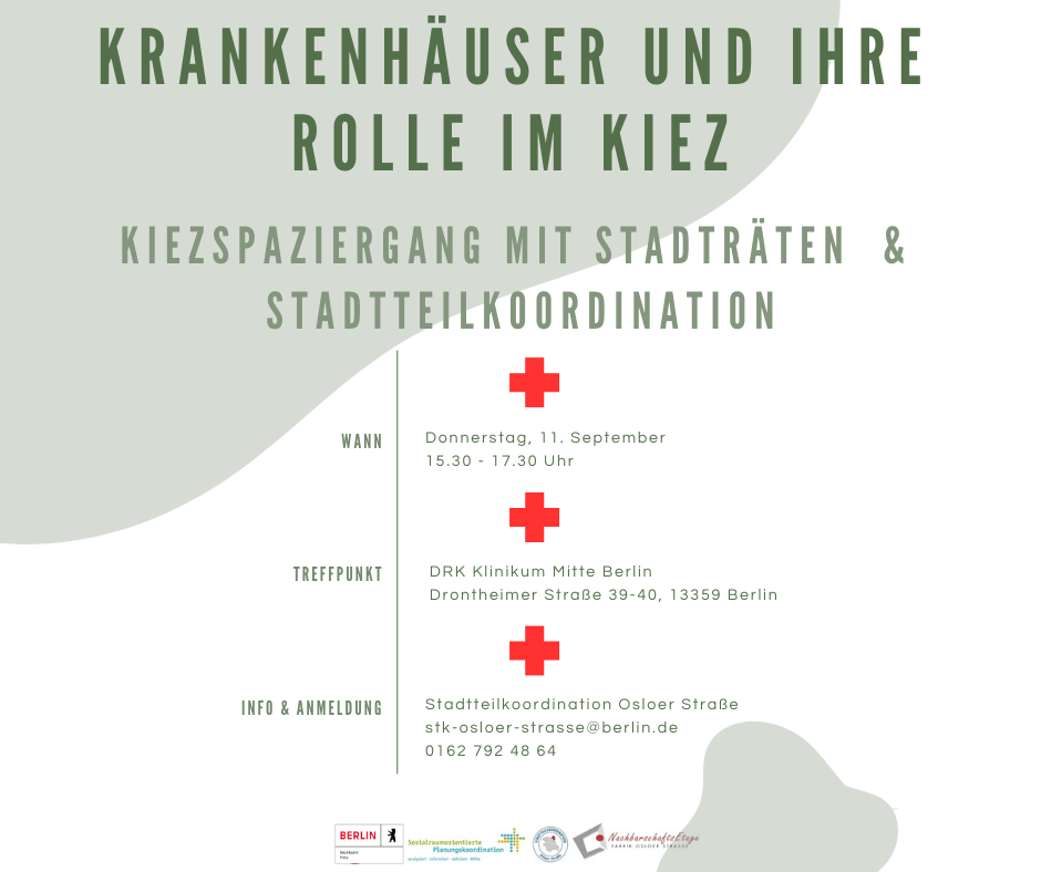 Am Donnerstag, den 11. September laden die Stadträte Ephraim Gothe und Christopher Schriner mit der Stadtteilkoordination Osloer Straße wieder von 15.30 bis 17.30 Uhr zum Kiezspaziergang ein. Das Thema des Rundgangs ist "Krankenhäuser und ihre Rolle im Kiez". Treffpunkt ist um 15.15 Uhr vor dem DRK Klinikum Mitte in der Drontheimer Straße 39-40. Auf dem…