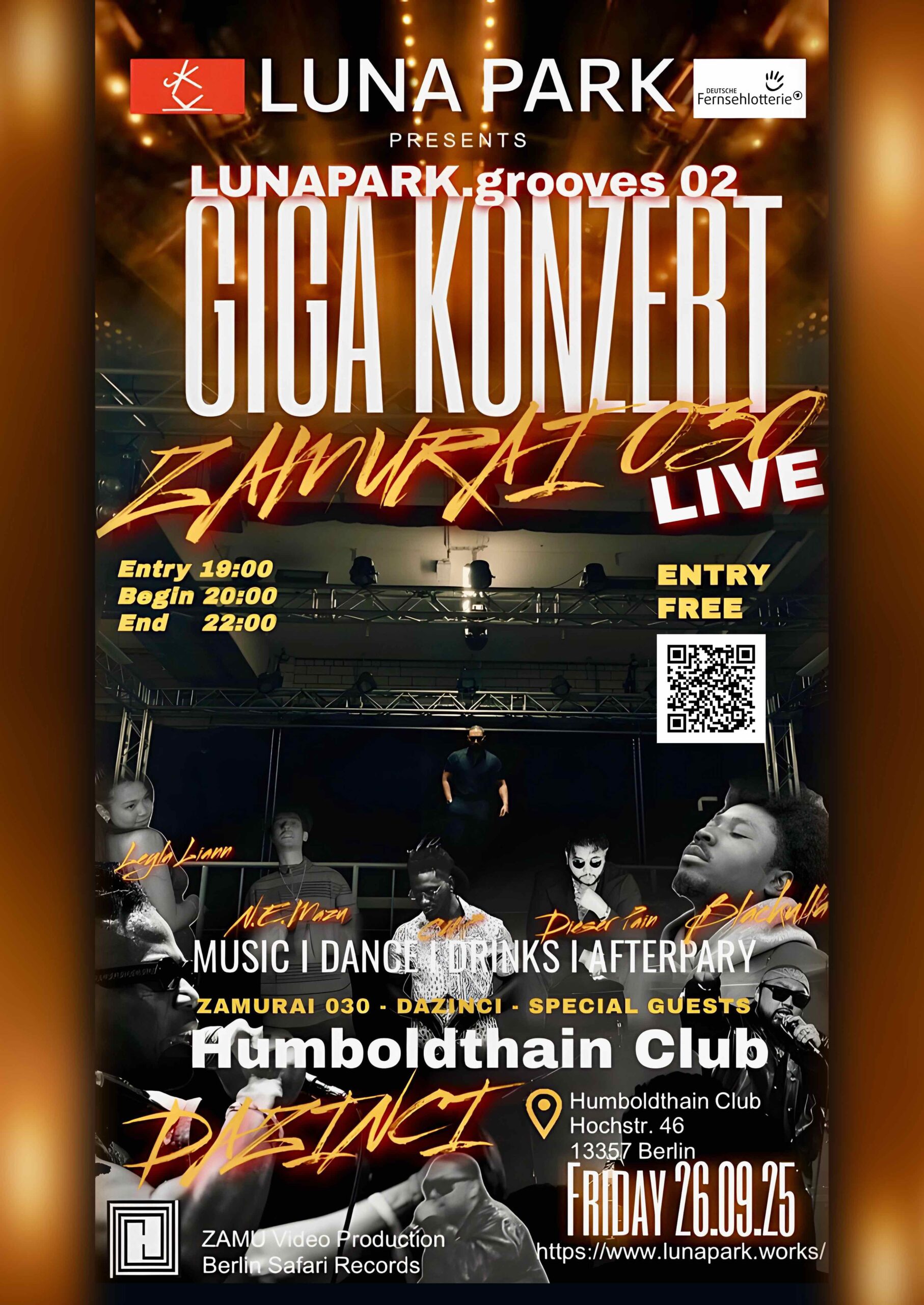 Humboldthain Club Hochstr. 46, BerlinZum zweiten Mal präsentiert die Initiative LUNA PARK zusammen mit dem künstlerischen Management-Label Berliner Safari ihr Format LUNAPARK.grooves und lädt ein zum GIGA CONCERT mit Interpreten aus der Berliner HipHop-Underground-Szene! Live dabei sind: Zamurai030, Blackulla, Dieser Pain, Dazinci, Leyla Liann, und andere. LUNAPARK.grooves 02 ist eine Produktion der Initiative LUNA PARK e.V., Kosmas Kosmopoulos und…